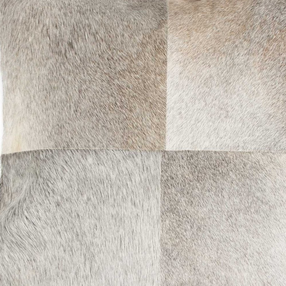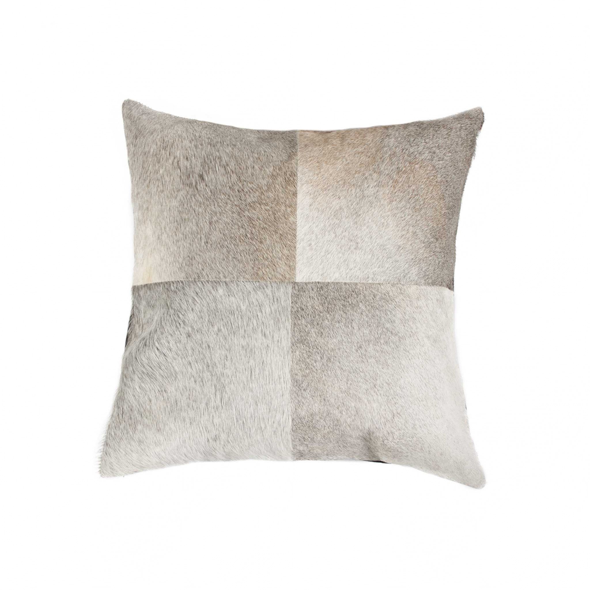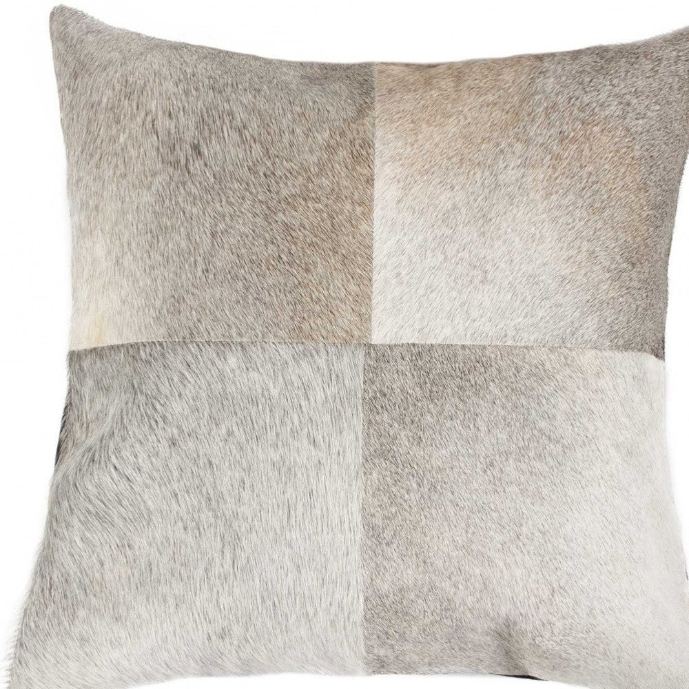 The perfect complement to your sofa, favorite chair, or bed, this 18-inch gray geometric color block cowhide throw pillow is a great decorative accent. The luxurious gray coloring of the natural and genuine cowhide will add dimension and texture to your space. Elegantly chic, this pillow is the epitome of luxury. This soft polyfill filled pillow not only is decorative but made to be comfy and cozy all day long. 18-inch H x 18-inch W x 5-inch D