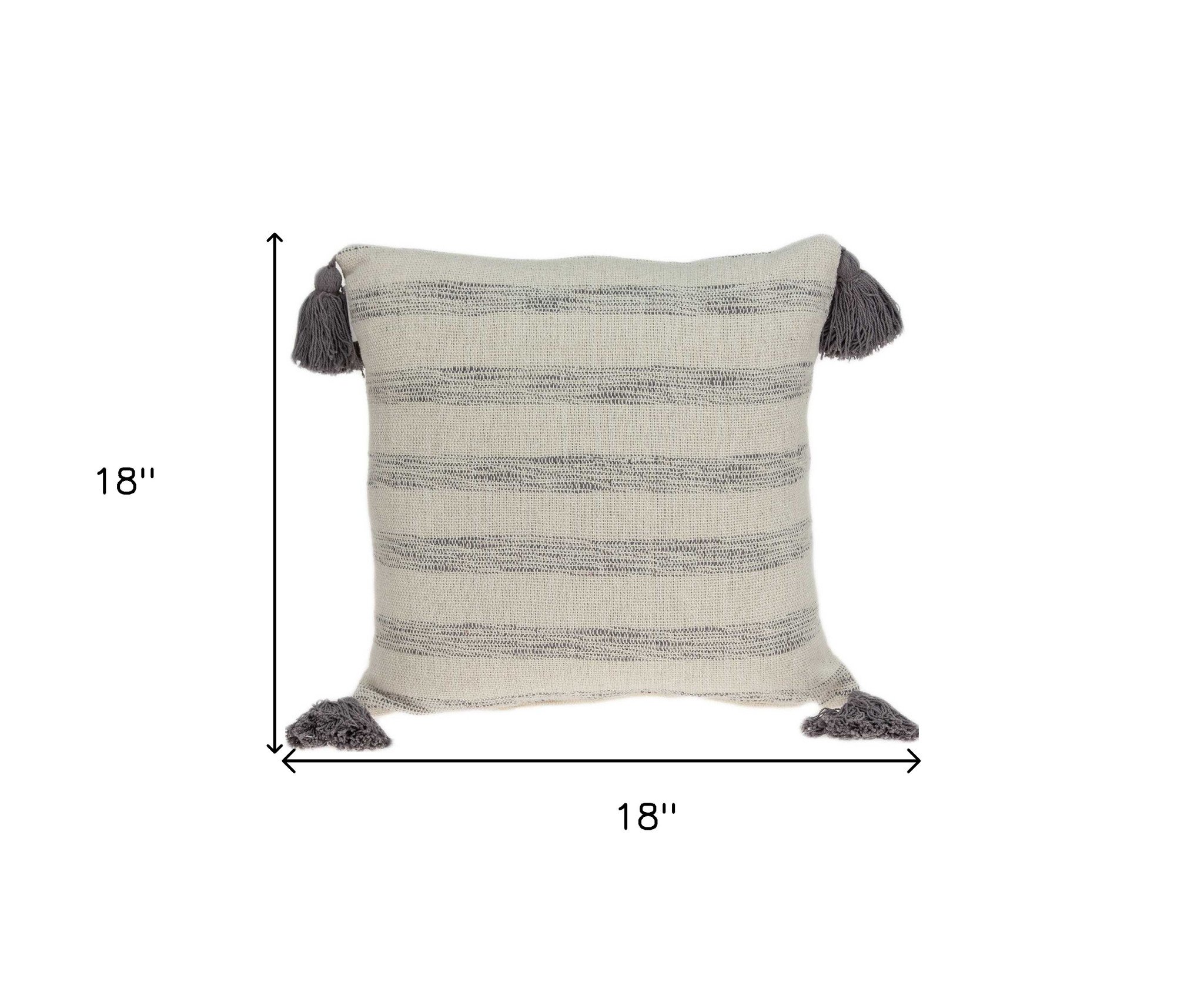 18" Beige and Gray Striped Cotton Throw Pillow With Tassels
