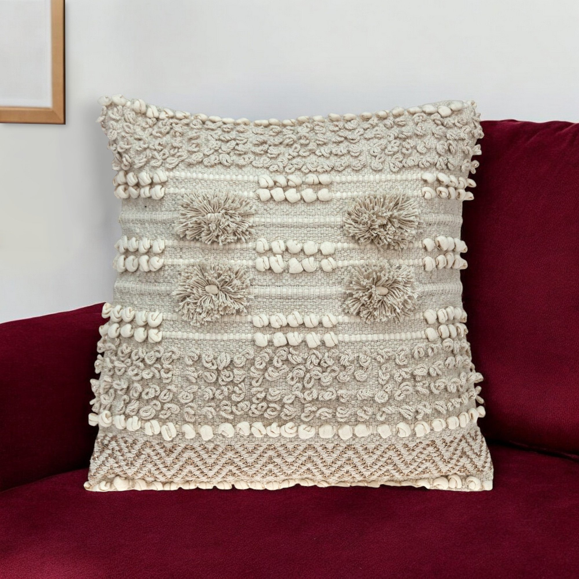 The Warm Ivory Chunky Throw Pillow will make you feel like you are enjoying the warmth of wearing your favorite sweater. The warm ivory color of the throw pillow exudes calmness and relaxation, and its hand woven pattern with numerous textures makes it an excellent decorative pillow. It has a zipper closure on the back for easy cleaning. 17.72” x 17.72” x 4”