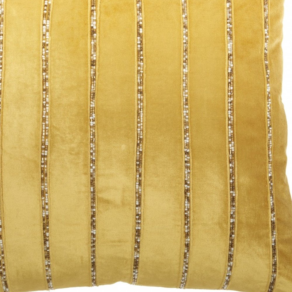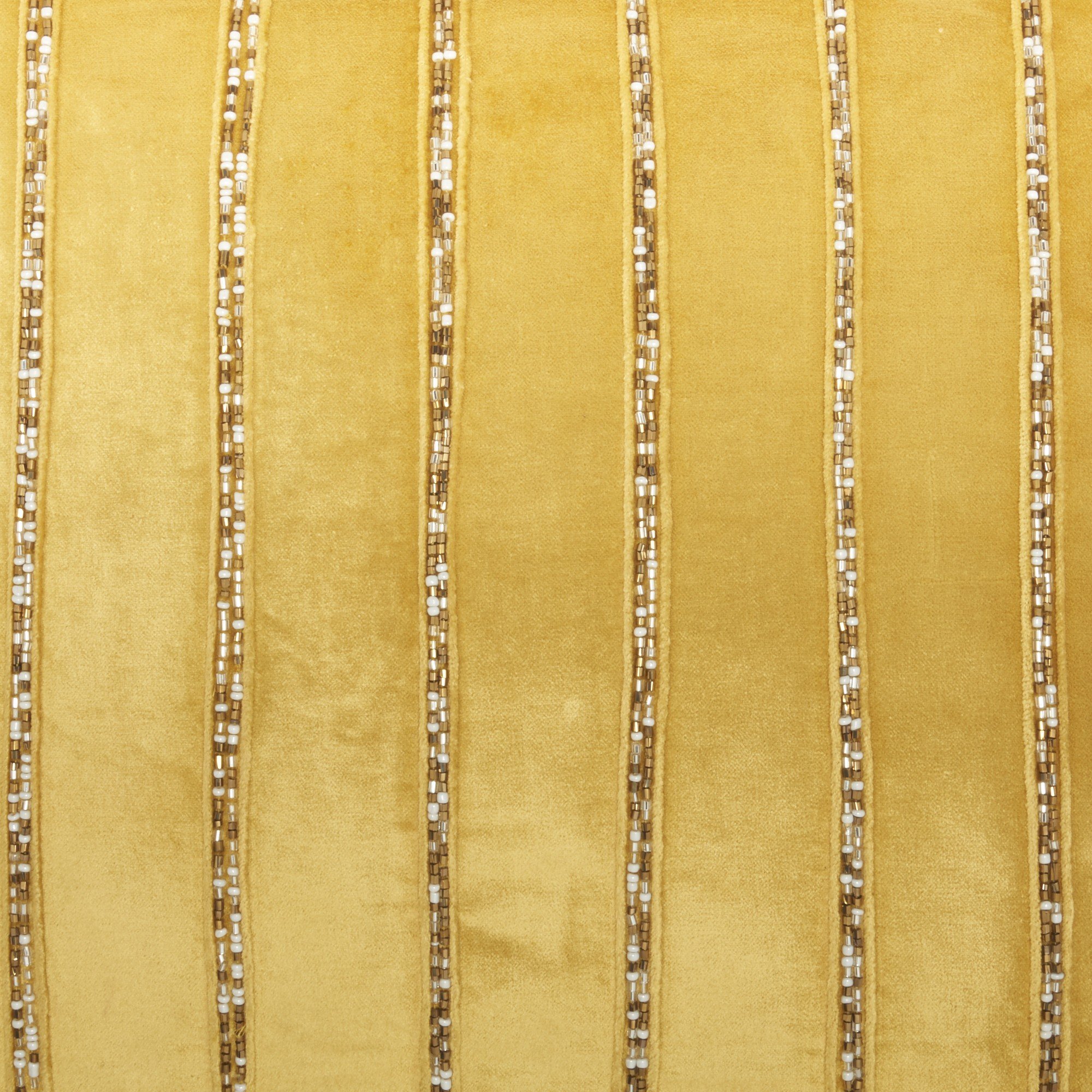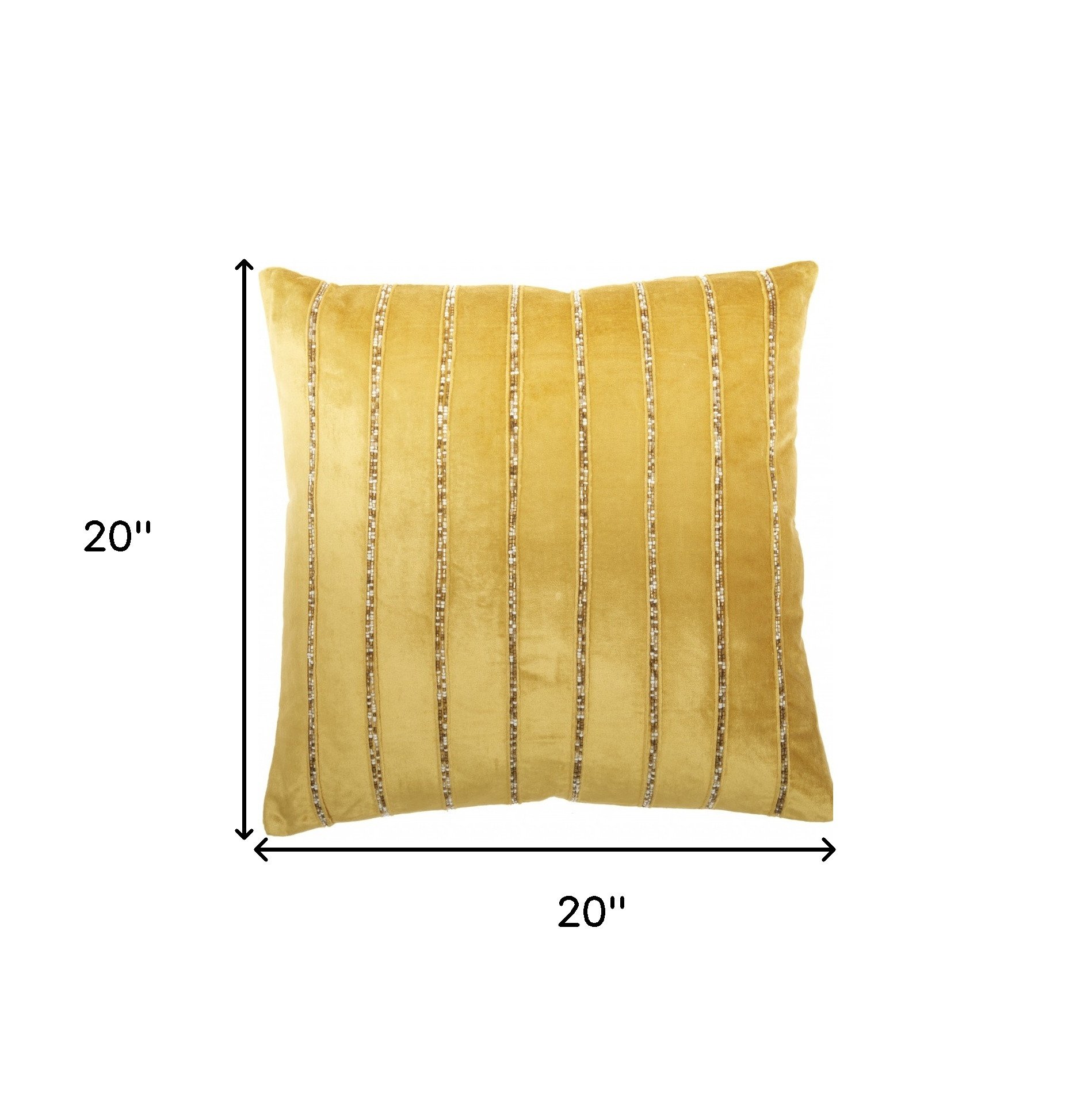 Achieve elegance and glamour in your interior with this 20-inch glam gold striped velvet throw pillow with sequins.. The gold coloring of the soft and long lasting velvet will add dimension and texture to your space. Decorative touches that are sequined give this great design some beautiful texture along with a hand-crafted look and feel. This soft polyester filled pillow not only is decorative but made to be comfy and cozy all day long. A great decorative accessory for your favorite chair, to accent your sofa, or to use as part of your bed ensemble. 20-inch H x 20-inch W x 5-inch D