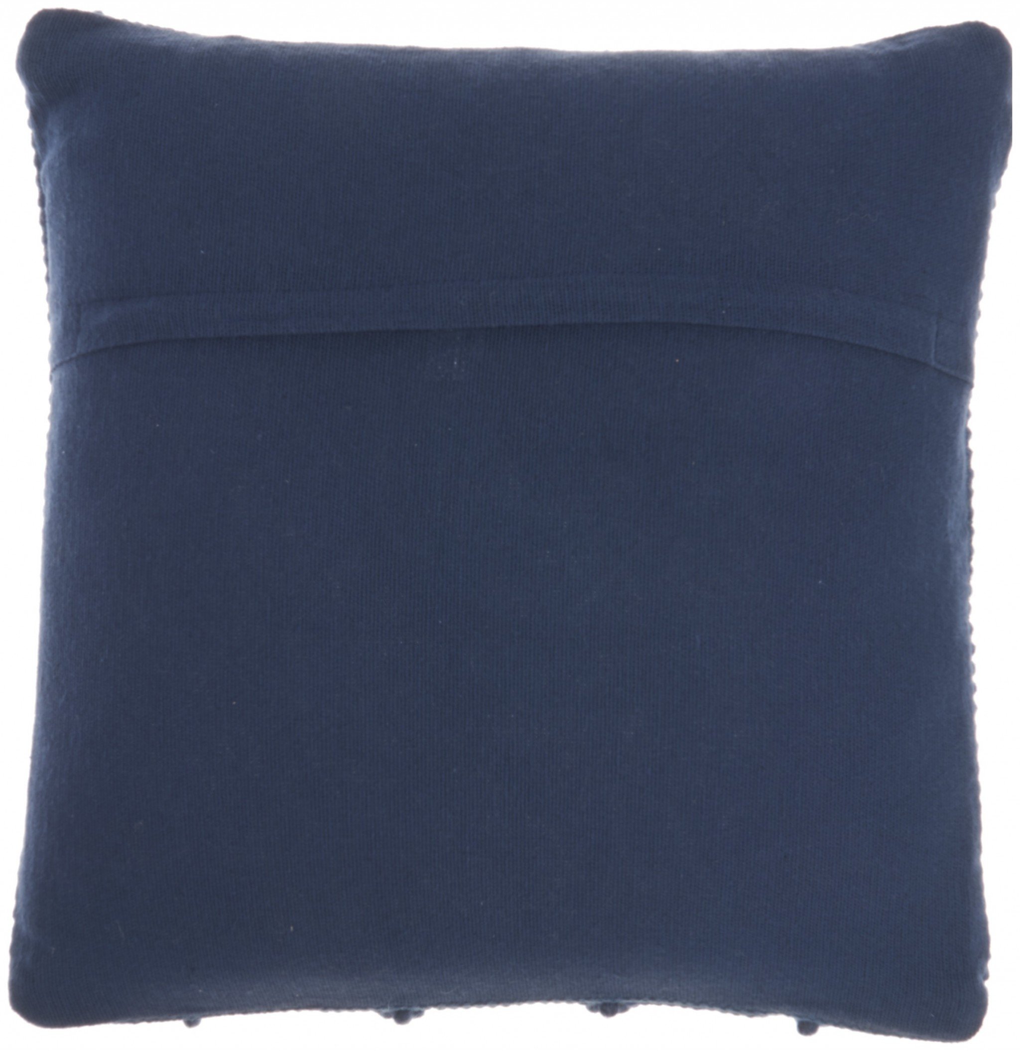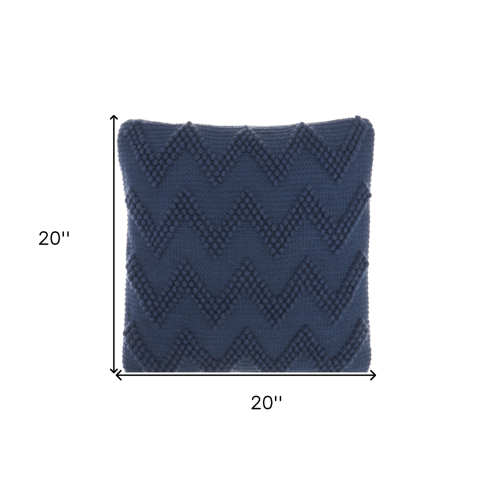 With this Dark Blue Chevron Detail Throw Pillow you can add the perfect finishing touch to your bed or your couch with a great combination of style and comfort. This pillow has a square shape and is covered in a textured dark blue colored fabric. This fabric serves as the perfect background for the detailed chevron pattern that is all along the front of this throw pillow. The chevron pattern is made of dark blue colored thread that is tightly wound in small circles. There are three layers of small circles in each of the chevron stripes which gives more depth and dimension to the overall look. This throw pillow will look great anywhere in your home and elevate the look of all the seating spaces you have. 6" H x 20" W x 20" D